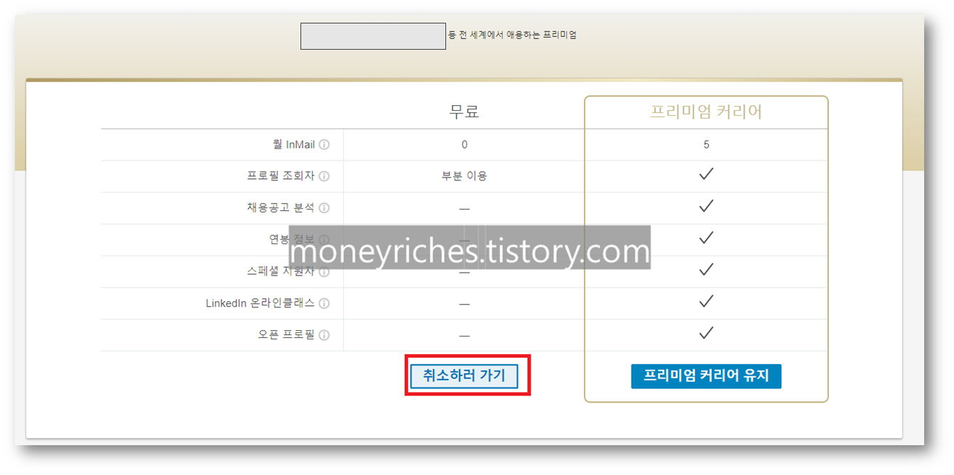 3. 링크드인 무료 계정과 프리미엄 계정의 차이가 나타난다. 무료 부분의 하단에 있는 "취소하러가기"를 선택한다.
