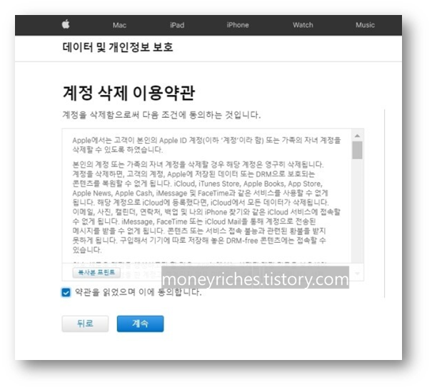 7. 애플 계정 삭제 이용약관이 나타나는데 약관을 읽고 계속 버튼을 누른다.