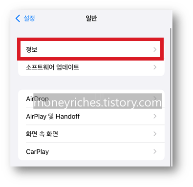 2) 일반 화면에서 정보 항목을 선택한다.