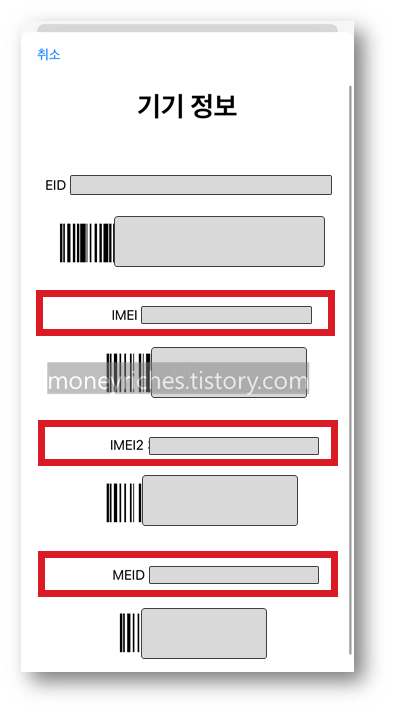 EID, IMEI, IMEI2, MEID 정보가 나타난다.