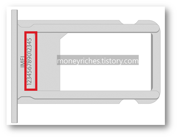유심을 넣는 트레이를 뽑아보면 아래 이미지처럼 IMEI 라는 번호를 찾을 수 있다. 아이폰 6s 이하 모델에서는 일련번호(시리얼 넘버)가 따로 적혀있는데 이후 기종에서는 아래와 같이 IMEI만 적혀있고 이를 일련번호로 사용이 가능하다고 한다.