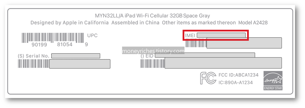 아직 애플 기기, 아이패드나 아이폰 등의 포장박스를 버리지 않은 경우에는 포장박스에서 아래와 같이 일련번호를 확인할 수 있다.